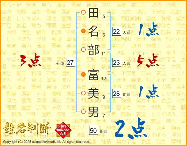 田(5画)名(6画)部(11画) 富(12画)美(9画)男(7画)