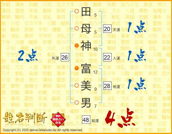 田(5画)母(5画)神(10画) 富(12画)美(9画)男(7画)