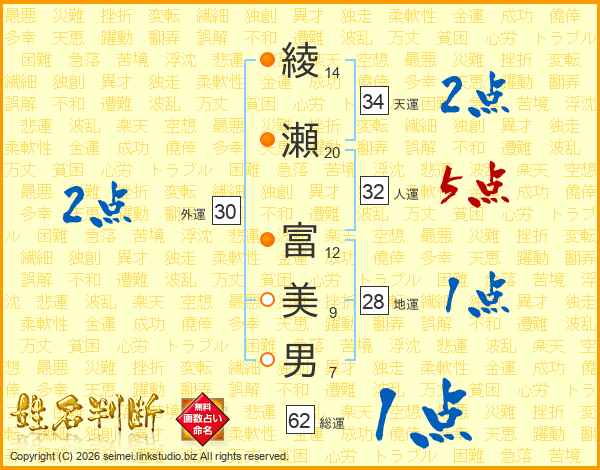 綾(14画)瀬(20画) 富(12画)美(9画)男(7画)
