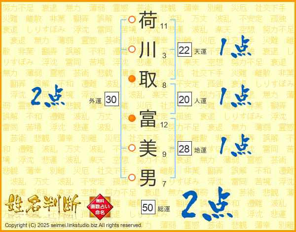 荷(11画)川(3画)取(8画) 富(12画)美(9画)男(7画)