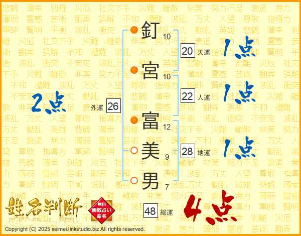 釘(10画)宮(10画) 富(12画)美(9画)男(7画)