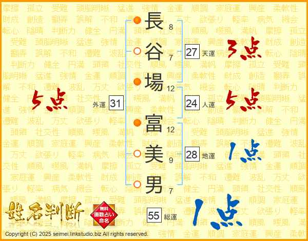 長(8画)谷(7画)場(12画) 富(12画)美(9画)男(7画)