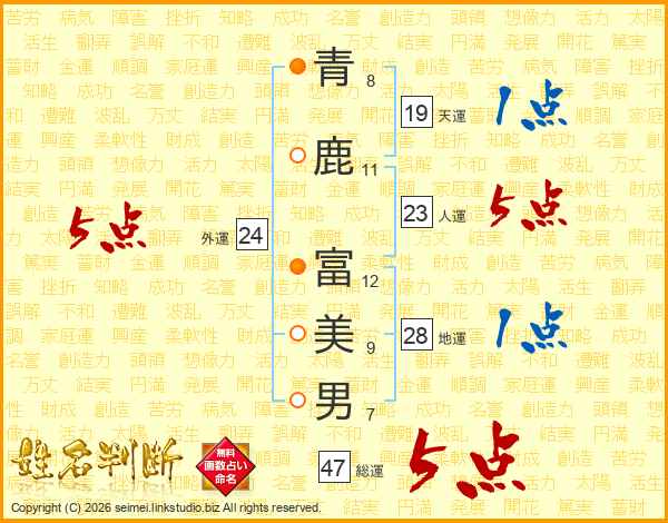 青(8画)鹿(11画) 富(12画)美(9画)男(7画)