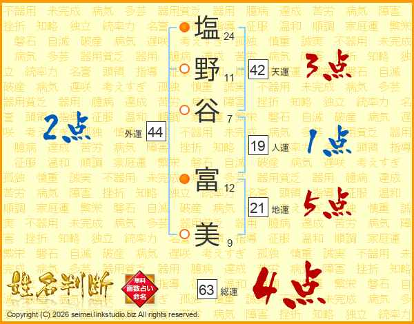 塩(24画)野(11画)谷(7画) 富(12画)美(9画)