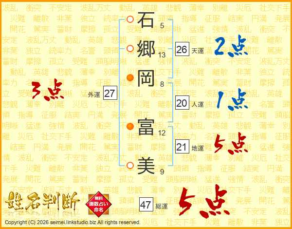 石(5画)郷(13画)岡(8画) 富(12画)美(9画)