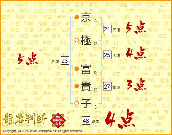 京(8画)極(13画) 富(12画)貴(12画)子(3画)