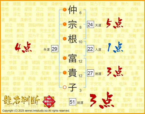 仲(6画)宗(8画)根(10画) 富(12画)貴(12画)子(3画)