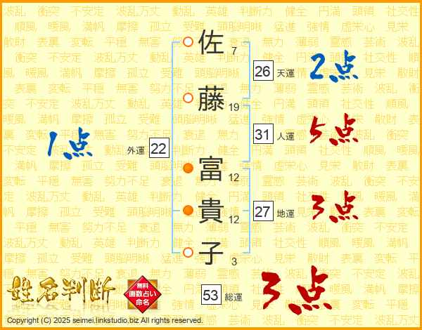 佐(7画)藤(19画) 富(12画)貴(12画)子(3画)
