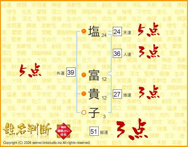 塩(24画) 富(12画)貴(12画)子(3画)