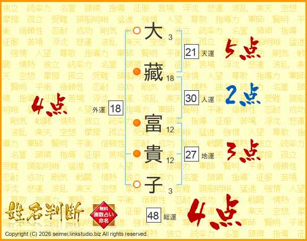 大(3画)藏(18画) 富(12画)貴(12画)子(3画)