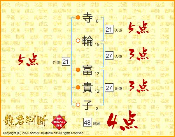 寺(6画)輪(15画) 富(12画)貴(12画)子(3画)