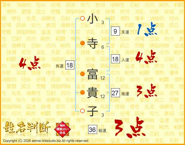 小(3画)寺(6画) 富(12画)貴(12画)子(3画)