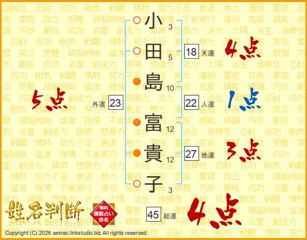 小(3画)田(5画)島(10画) 富(12画)貴(12画)子(3画)