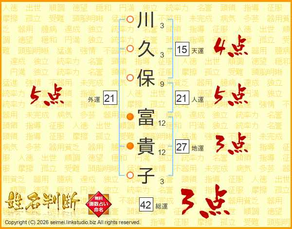 川(3画)久(3画)保(9画) 富(12画)貴(12画)子(3画)