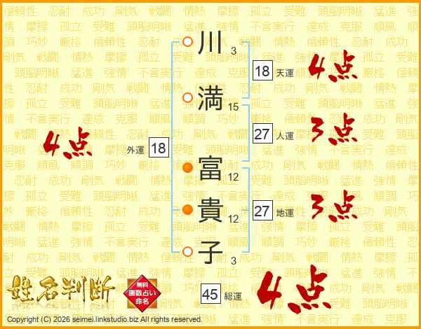 川(3画)満(15画) 富(12画)貴(12画)子(3画)