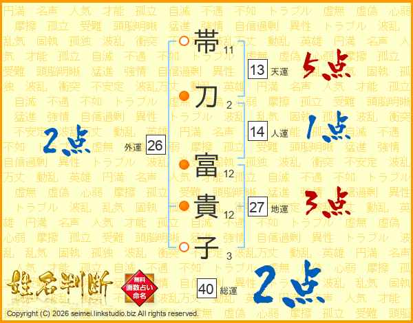 帯(11画)刀(2画) 富(12画)貴(12画)子(3画)