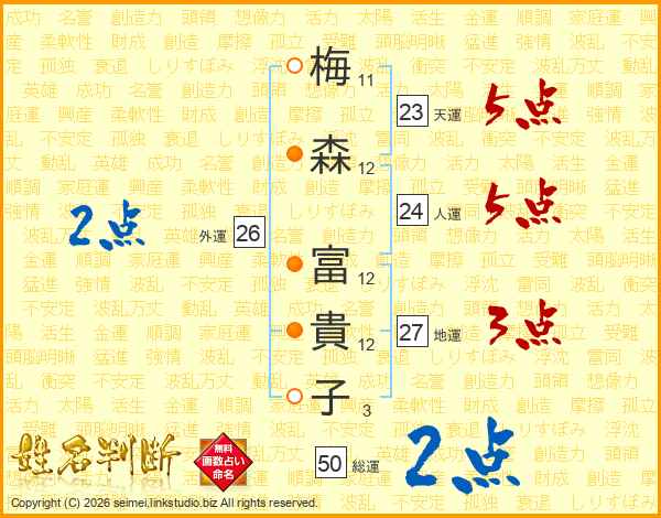 梅(11画)森(12画) 富(12画)貴(12画)子(3画)