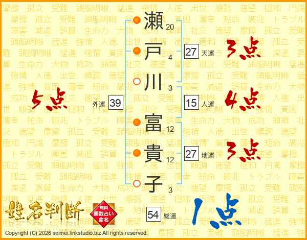 瀬戸川富貴子さんの天運は27画の3点!