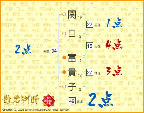 関(19画)口(3画) 富(12画)貴(12画)子(3画)