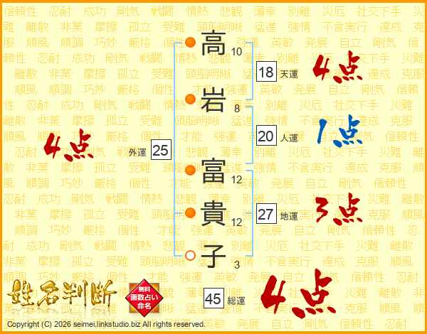 高(10画)岩(8画) 富(12画)貴(12画)子(3画)