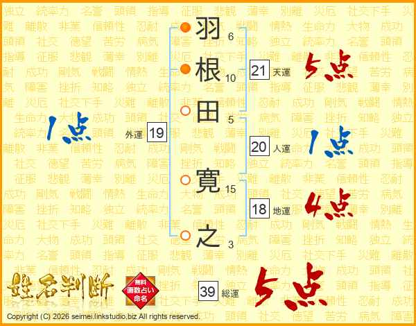 羽(6画)根(10画)田(5画) 寛(15画)之(3画)