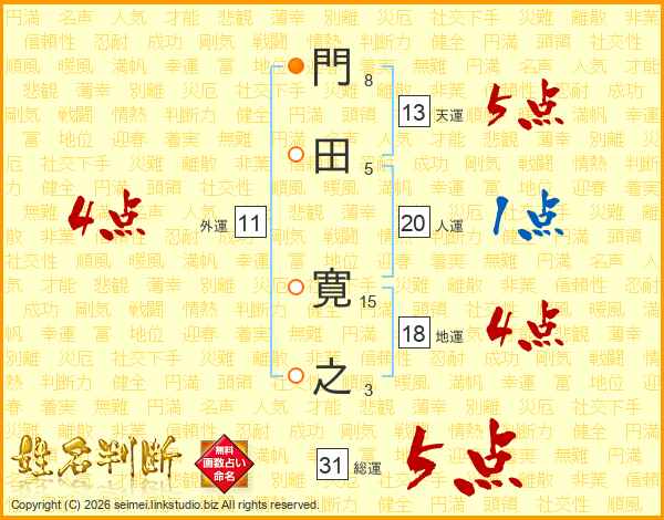 門(8画)田(5画) 寛(15画)之(3画)
