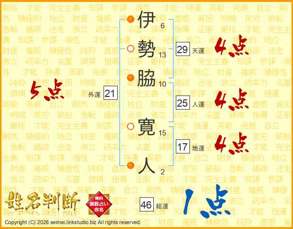 伊(6画)勢(13画)脇(10画) 寛(15画)人(2画)