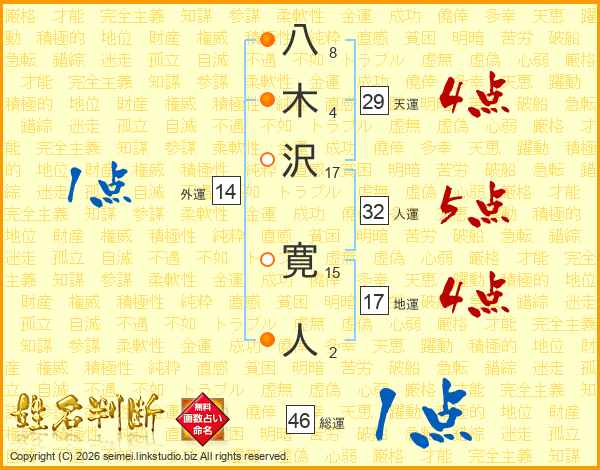 八(8画)木(4画)沢(17画) 寛(15画)人(2画)