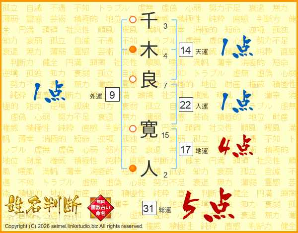 千(3画)木(4画)良(7画) 寛(15画)人(2画)