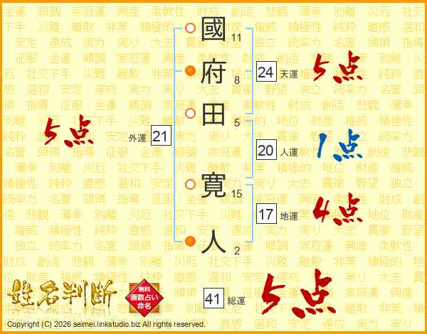 國(11画)府(8画)田(5画) 寛(15画)人(2画)