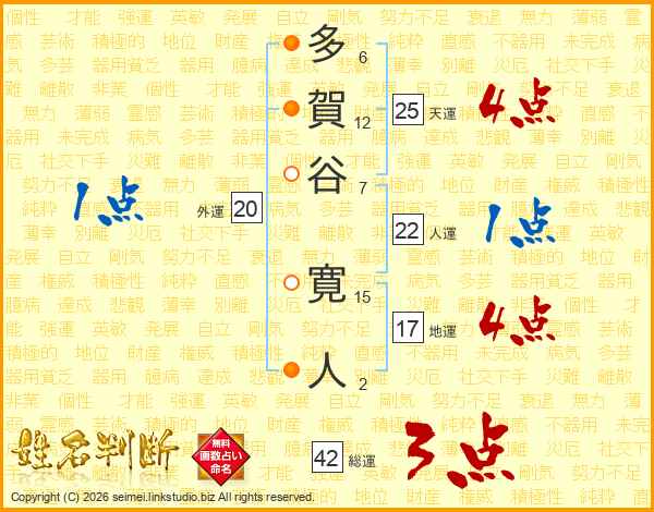 多(6画)賀(12画)谷(7画) 寛(15画)人(2画)