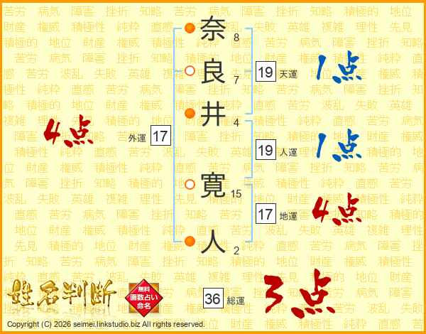 奈(8画)良(7画)井(4画) 寛(15画)人(2画)