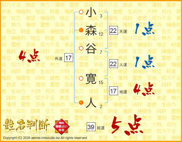 小森谷寛人さんの総運は39画の5点!