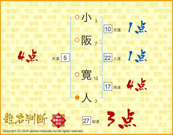 生活面を象徴する運勢です。外部から受ける影響力を表し、結婚運、家庭運や職場、環境への順応性を表します。総運から人運を引いた画数。姓や名が1文字の場合を除く。