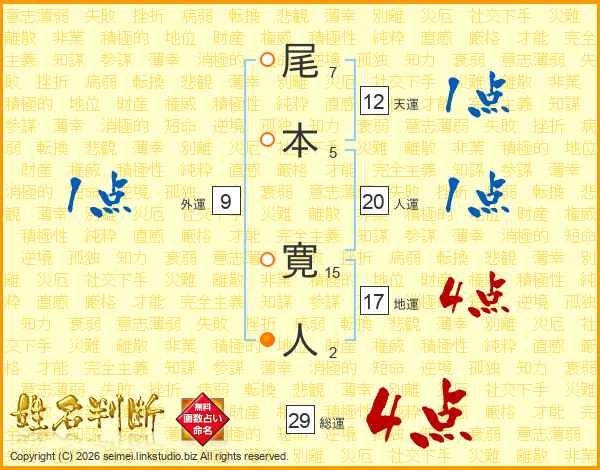 尾本寛人さんの総運は29画の4点!