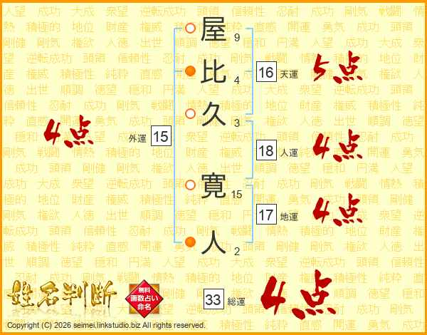 屋(9画)比(4画)久(3画) 寛(15画)人(2画)