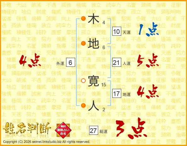 木(4画)地(6画) 寛(15画)人(2画)