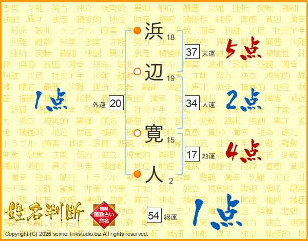 浜(18画)辺(19画) 寛(15画)人(2画)