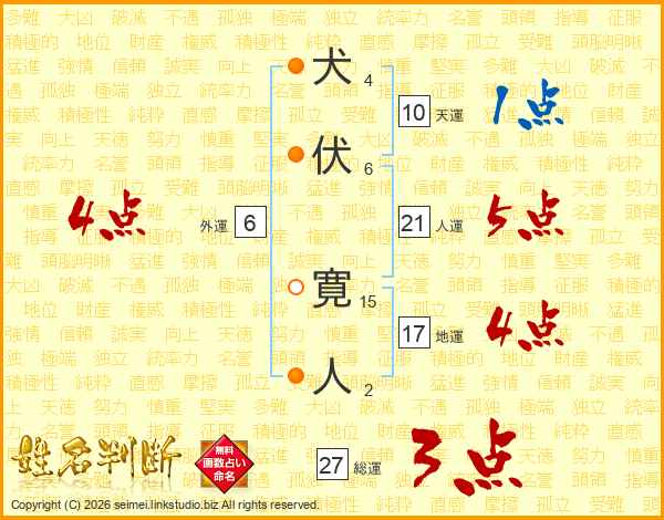 犬(4画)伏(6画) 寛(15画)人(2画)