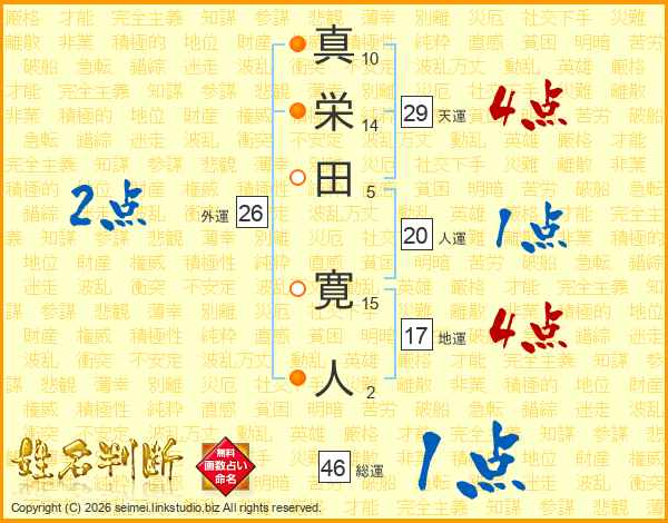 真(10画)栄(14画)田(5画) 寛(15画)人(2画)