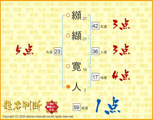 生活面を象徴する運勢です。外部から受ける影響力を表し、結婚運、家庭運や職場、環境への順応性を表します。総運から人運を引いた画数。姓や名が1文字の場合を除く。