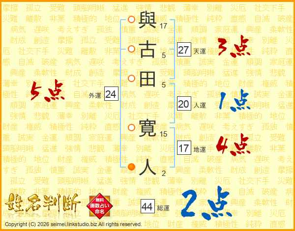 與(17画)古(5画)田(5画) 寛(15画)人(2画)