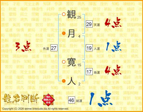 観(25画)月(4画) 寛(15画)人(2画)