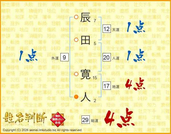 生活面を象徴する運勢です。外部から受ける影響力を表し、結婚運、家庭運や職場、環境への順応性を表します。総運から人運を引いた画数。姓や名が1文字の場合を除く。