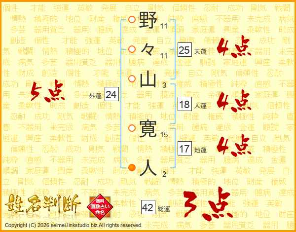 野(11画)々(11画)山(3画) 寛(15画)人(2画)