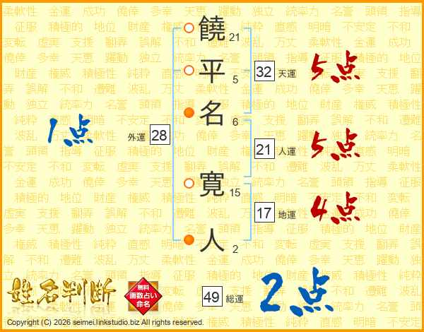 饒(21画)平(5画)名(6画) 寛(15画)人(2画)