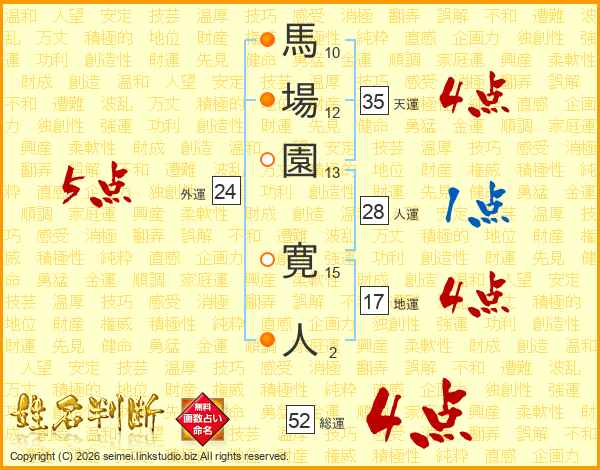 馬場園寛人さんの総運は52画の4点!