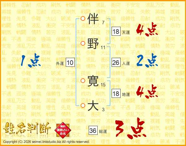 あなたの人生を表す1番重要な運勢です。生涯を通じて影響する総合運となり、主に50歳以降の晩年期に影響を及ぼします。苗字と名前の合計画数。