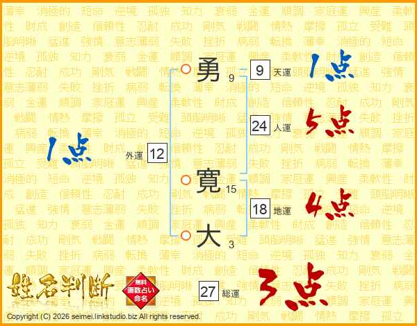 生活面を象徴する運勢です。外部から受ける影響力を表し、結婚運、家庭運や職場、環境への順応性を表します。総運から人運を引いた画数。姓や名が1文字の場合を除く。