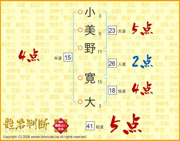 小(3画)美(9画)野(11画) 寛(15画)大(3画)